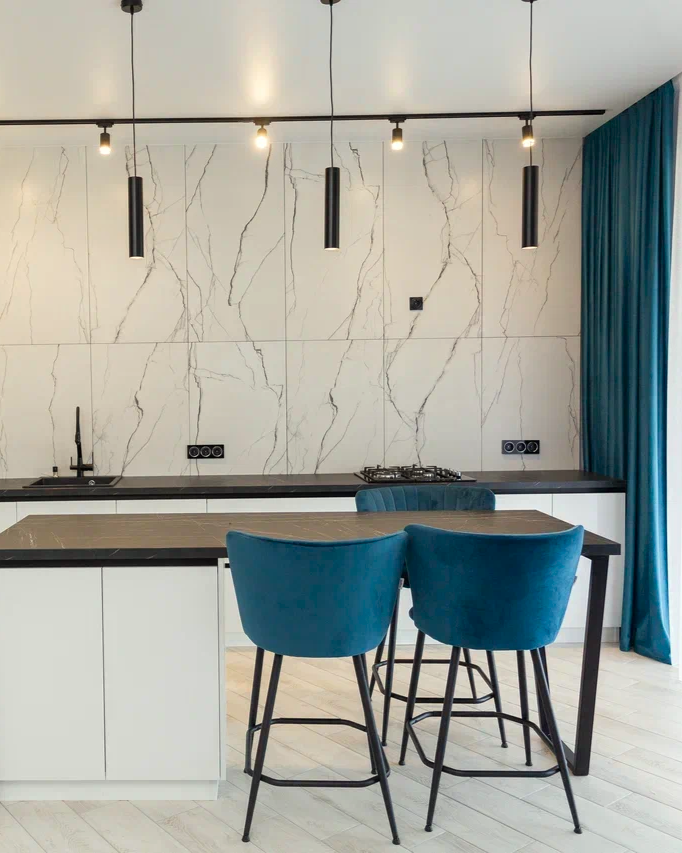 Заказчик пришел к нам на черновом этапе ремонта - разработали проекты расположения розеток и укладки плитки для фартука, тем самым избежали проблемы с расположением розеток и прилеганием плитки.